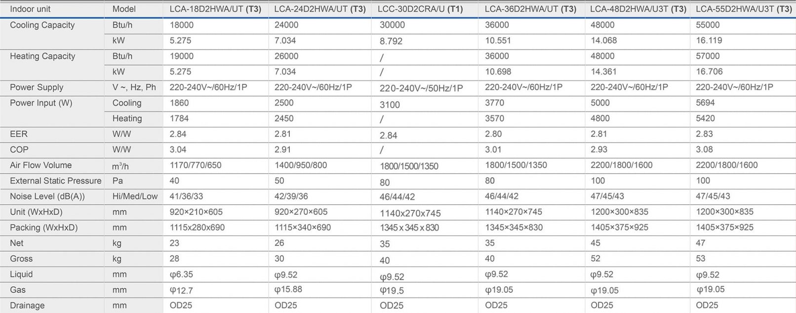 - LCA-18D2HWA/UT (T3), LCA-24D2HWA/UT (T3), LCC-30D2CRA/U (T1), LCA-36D2HWA/UT (T3), LCA-48D2HWA/U3T (T3), LCA-55D2HWA/U3T (T3)